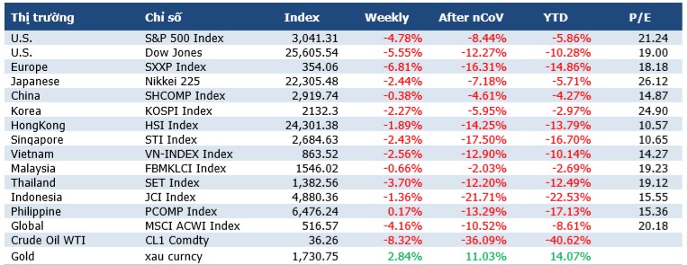 Thị trường cổ phiếu toàn cầu ghi nhận tuần giao dịch tồi tệ nhất trong gần 3 tháng qua, trước những lo sợ về làn sóng lây nhiễm thứ hai, nghi ngờ về khả năng phục hồi nhanh chóng của nền kinh tế và áp lực chốt lời của nhà đầu tư. Sự thay đổi tâm lý trên thị trường diễn ra khá nhanh và bất ngờ trong tuần qua khi các chỉ số cổ phiếu vẫn tiếp tục đi lên vào đầu tuần. Trong đó, chỉ số cổ phiếu Mỹ S&P500 lần đầu tiên ghi nhận mức lợi nhuận YTD dương trong năm nay, và Nasdaq Composite cũng chạm ngưỡng cao kỷ lục mới. Động lực tăng giá của thị trường cổ phiếu phai nhạt dần vào giữa tuần khi diễn ra cuộc họp chính sách định kỳ của Fed. Những tuyên bố của chủ tịch Fed Jerome Powell sau cuộc họp này đã không có nhiều bất ngờ với các nhà hoạch định chính sách quyết định giữ nguyên lãi suất gần ngưỡng 0%, tiếp tục mua tài sản theo nhịp độ hiện tại và có thể duy trì các biện pháp nới lỏng này ít nhất là đến năm 2022, không có biện pháp kích thích mới nào được đưa ra. Điểm đáng chú ý duy nhất có thể là những đánh giá triển vọng kinh tế khá thận trọng của Fed. Cụ thể, NHTW này dự báo tỷ lệ thất nghiệp Mỹ sẽ ở mức 9,3% vào cuối năm 2020, quá trình phục hồi sẽ mất nhiều thời gian và một số công việc có thể mất đi vĩnh viễn.