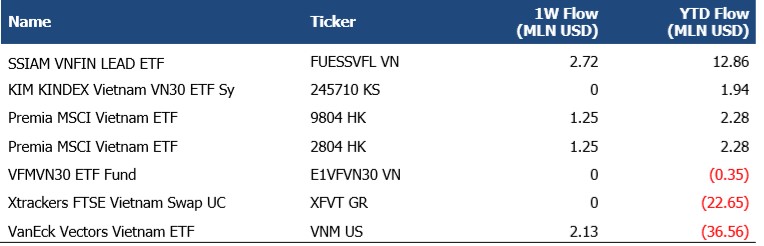 Về dòng vốn đầu tư quốc tế: Mạch mua ròng của NĐTNN đã trở lại nhiều hơn như tại Ấn Độ, Nhật Bản, Brazil, Thái Lan…. Ở thị trường trong nước, dòng vốn qua kênh ETF trong tuần vừa qua rất tích cực với nhiều quỹ trở lại mua ròng tổng công hơn 6,9 triệu USD qua đó thu hẹp lượng rút ròng kể từ đầu năm xuống còn 40,56 triệu USD, lượng bán ròng vẫn chủ yếu tập trung ở 2 quỹ FTSE và VanEck..