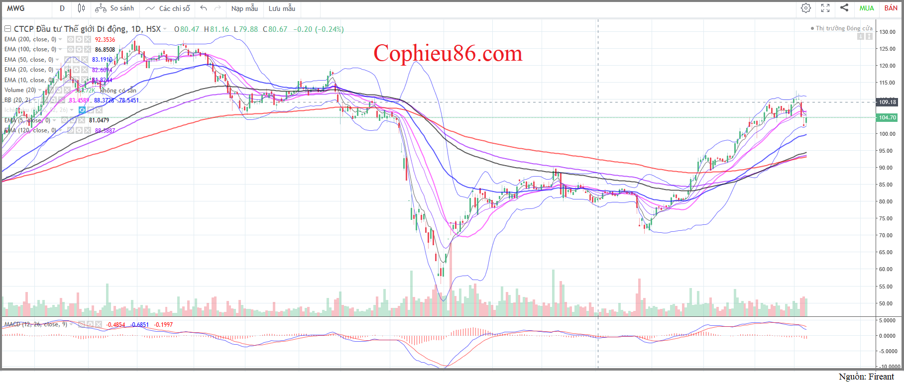 Đồ thị phân tích kỹ thuật cổ phiếu MWG cập nhật đến ngày 30/10/2020.