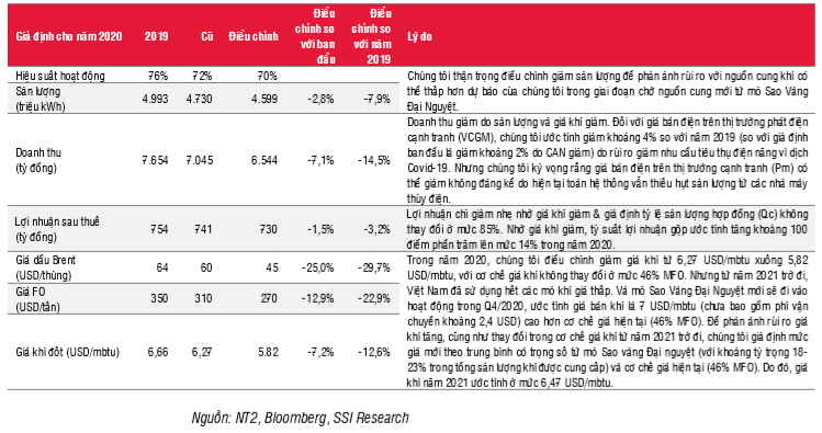 Trong năm 2020, chúng tôi điều chỉnh giảm giả định cho giá dầu Brent xuống 45 USD/thùng (-29,7% YoY) và giá FO xuống 270 USD/thùng (-22,9% YoY) do căng thẳng giữa Nga và Ả Rập Saudi, và triển vọng nhu cầu giảm từ Trung Quốc do dịch Covid-19 bùng. Với sự thay đổi giả định giá FO như vậy, chúng tôi điều chỉnh một số giả định chính như bảng sau: