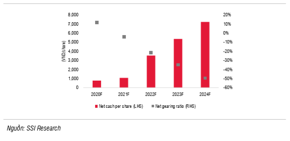 Tiền mặt trên mỗi cổ phiếu so với tỷ lệ nợ ròng/VCSH: NT2 sẽ được hưởng vị thế tiền mặt ròng từ năm 2021 trở đi.